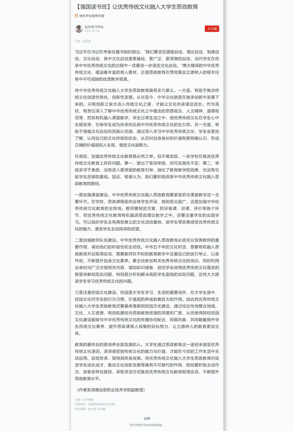 5月26日,学习强国发布《【强国读书班】让优秀传统文化融入大学生思政教育》