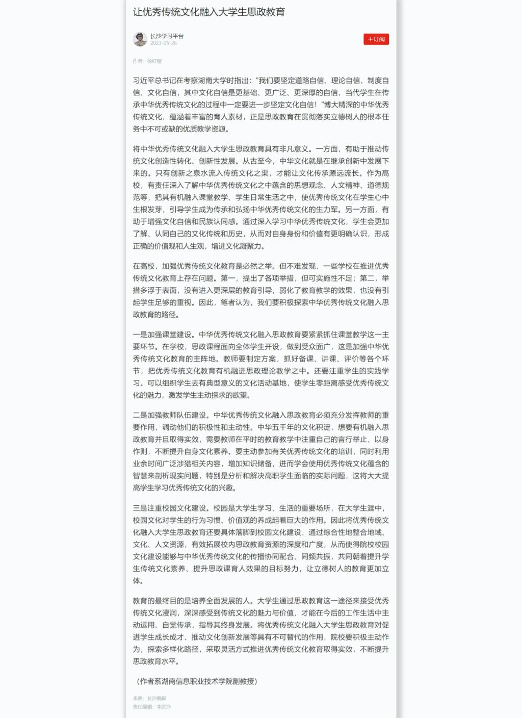 5月26日,学习强国发布《让优秀传统文化融入大学生思政教育》