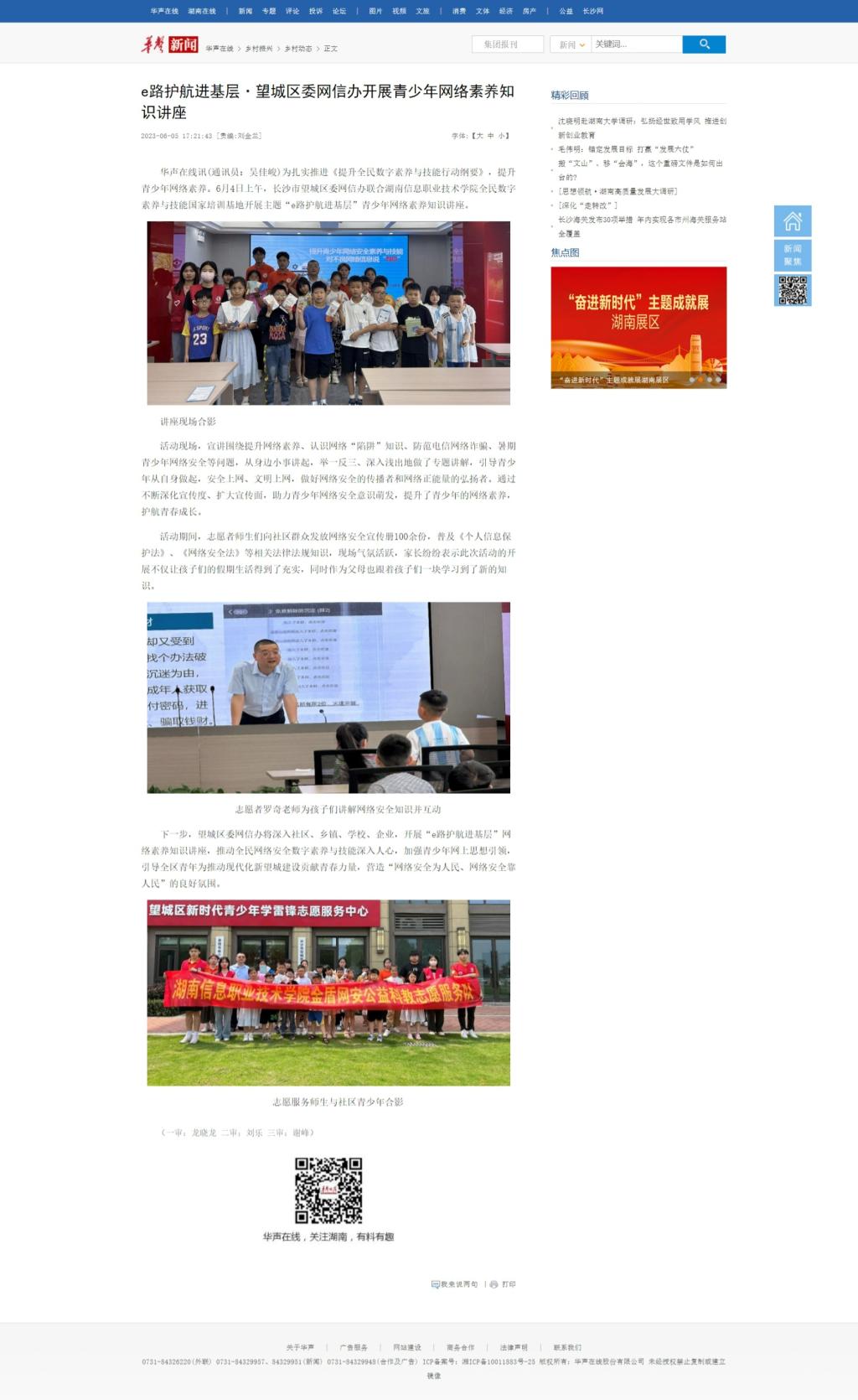 6月5日,华声在线发布《e路护航进基层·望城区委网信办开展青少年网络素养知识讲座》