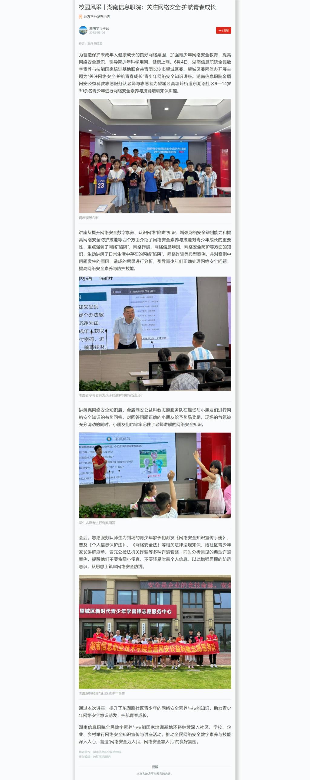 6月6日,学习强国发布《校园风采丨湖南信息职院:关注网络安全·护航青春成长》
