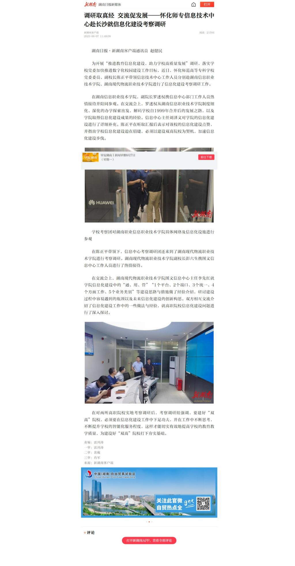 6月7日,新湖南客户端发布《调研取真经 交流促发展——怀化师专信息技术中心赴长沙就信息化建设考察调研》