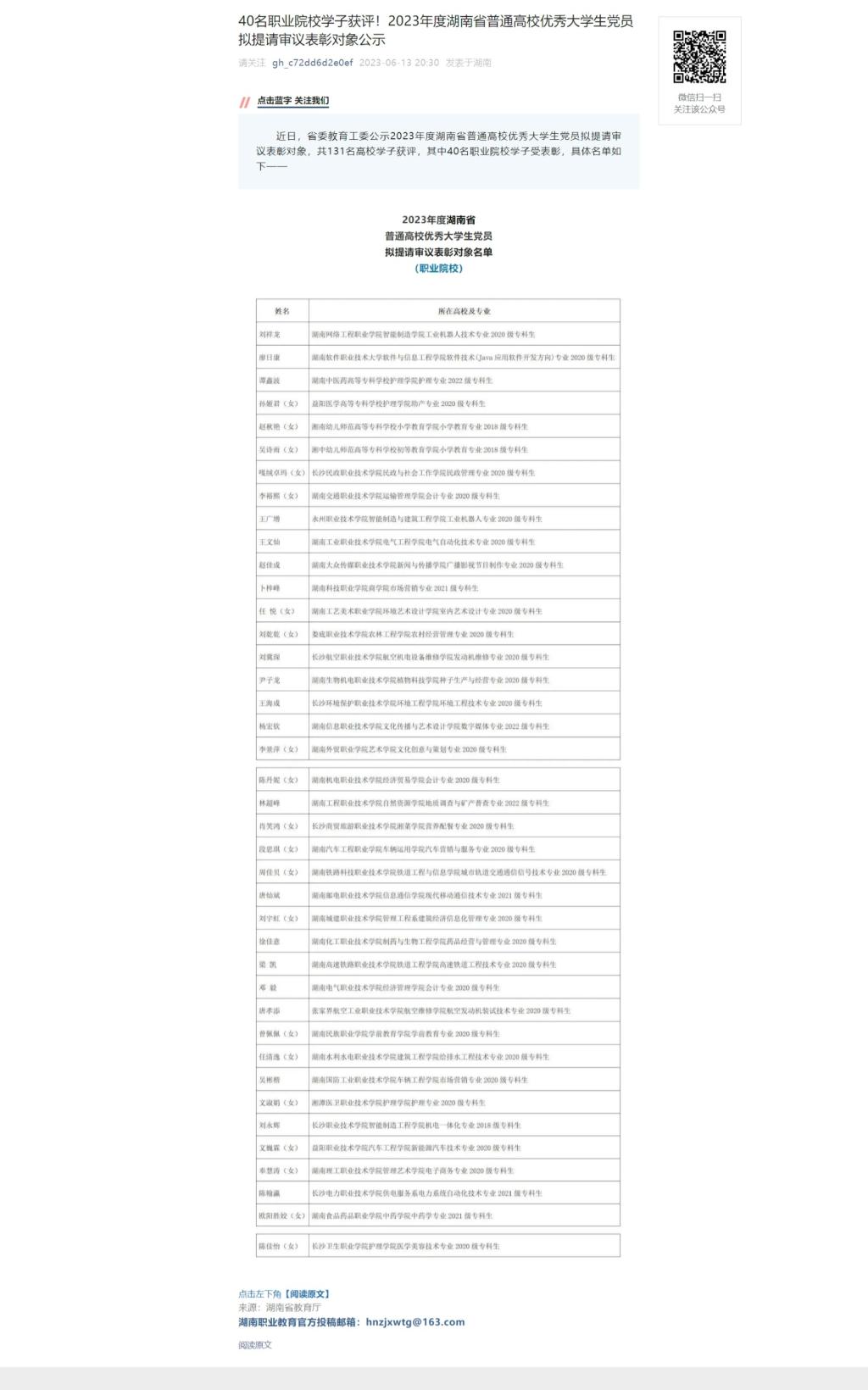 6月13日,微信(湖南职业教育)发布《40名职业院校学子获评!2023年度湖南省普通高校优秀大学生党员拟提请审议表彰对象公示》
