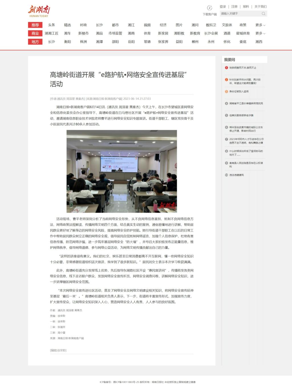 6月14日,新湖南发布《高塘岭街道开展“e路护航•网络安全宣传进基层”活动》