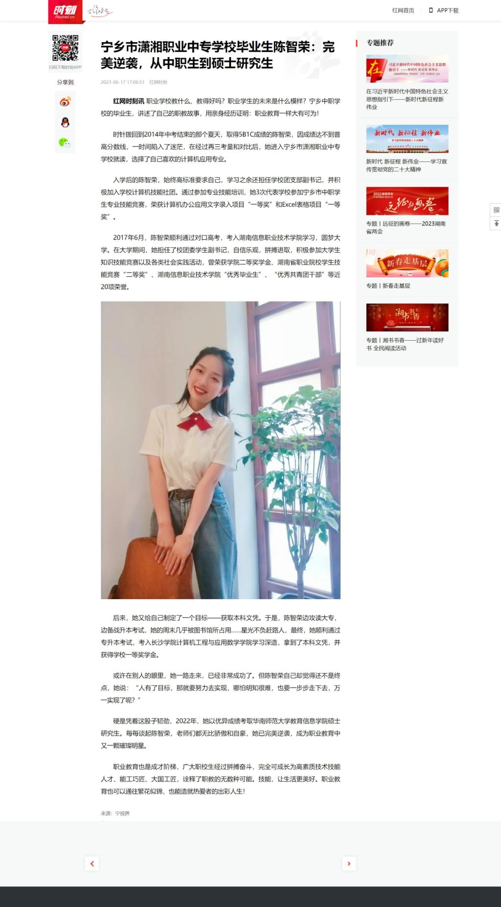 6月17日,红网发布《宁乡市潇湘职业中专学校毕业生陈智荣:完美逆袭,从中职生到硕士研究生》