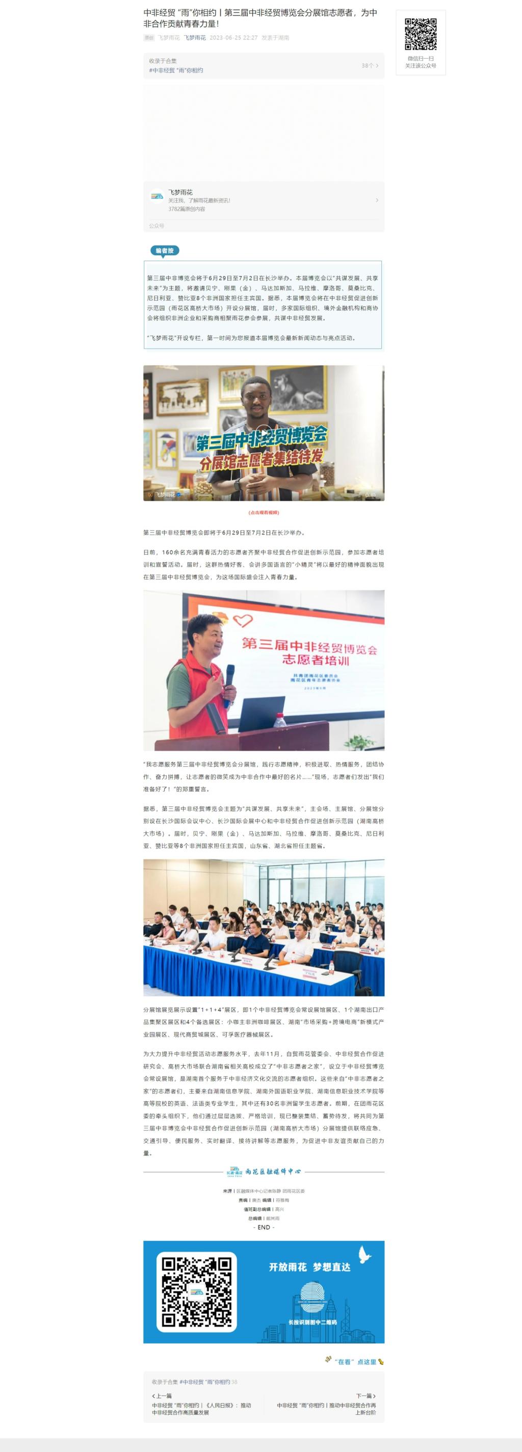 6月25日,微信(飞梦雨花)发布《中非经贸 “雨”你相约丨第三届中非经贸博览会分展馆志愿者,为中非合作贡献青春力量!》