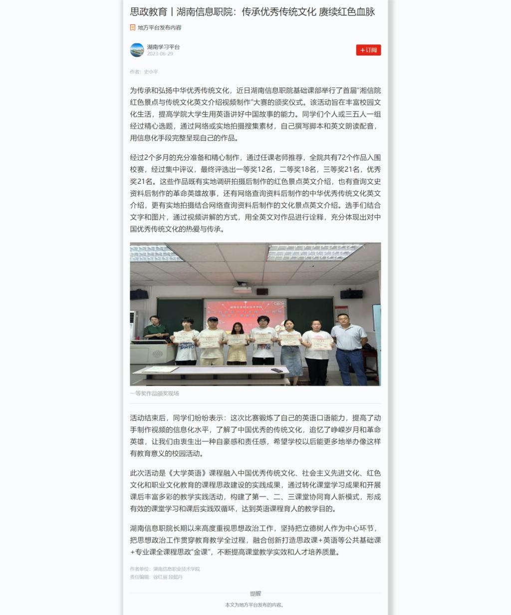 6月29日,学习强国发布《思政教育丨湖南信息职院:传承优秀传统文化 赓续红色血脉》