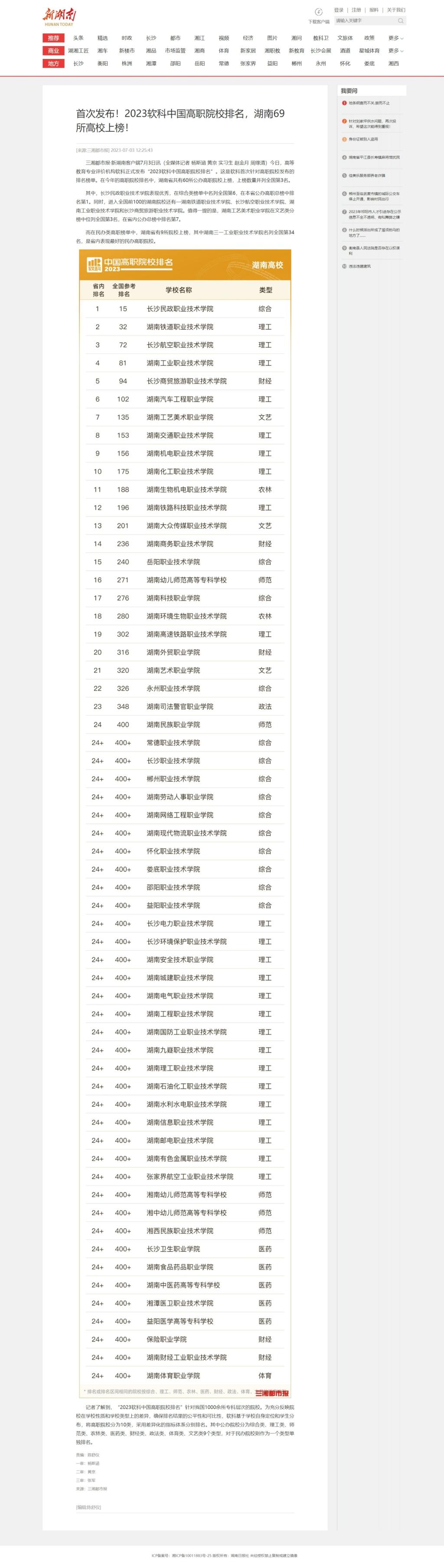 7月3日,新湖南发布《首次发布!2023软科中国高职院校排名,湖南69所高校上榜!》