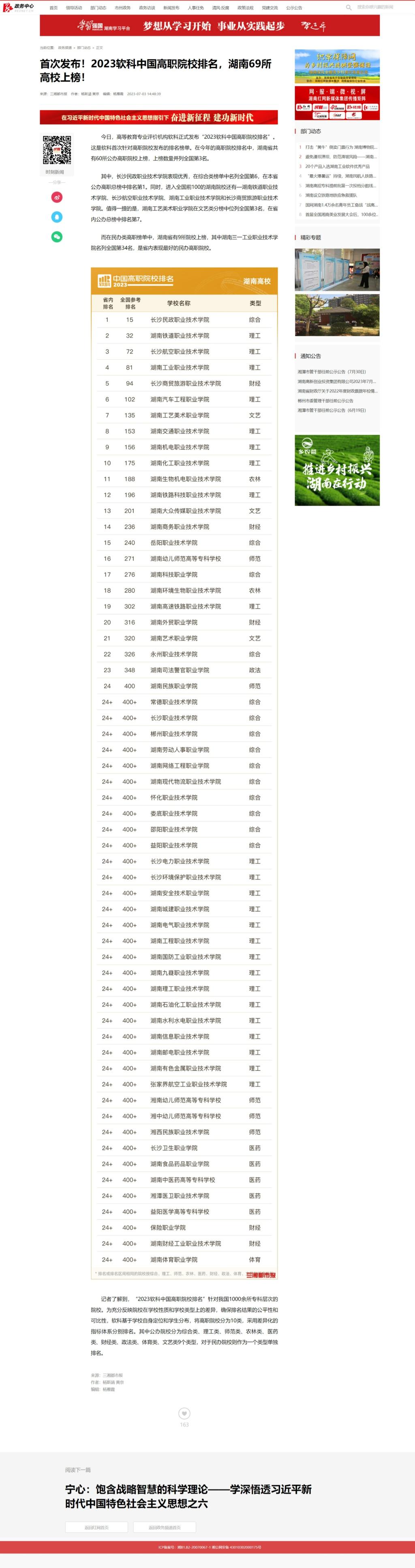 7月3日,红网发布《首次发布!2023软科中国高职院校排名,湖南69所高校上榜!》