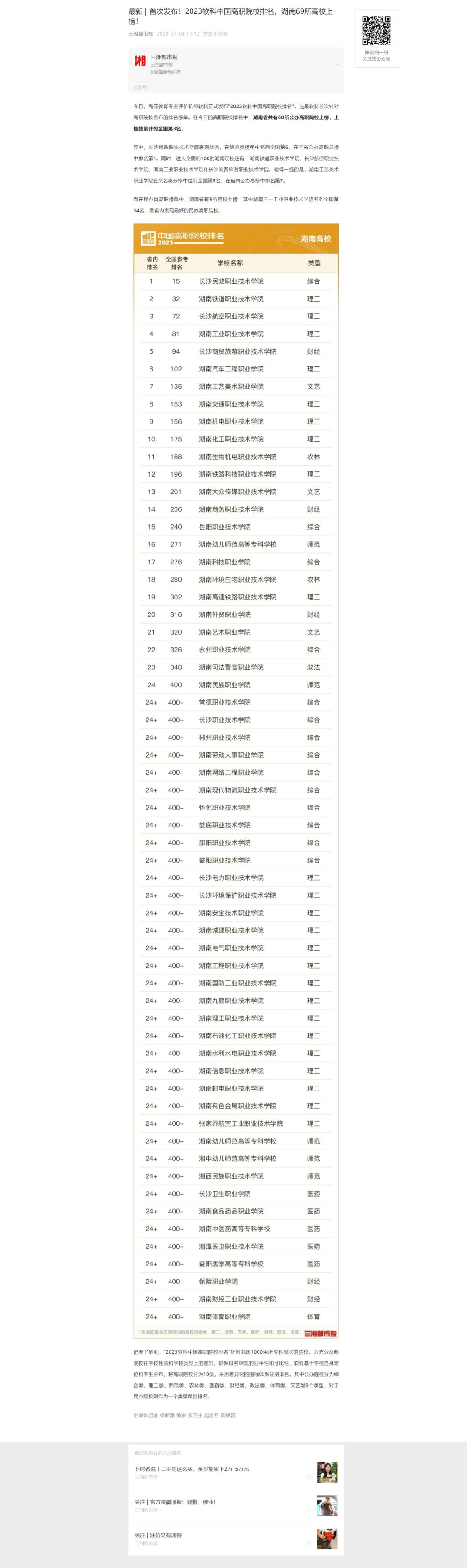 7月3日,微信(三湘都市报)发布《最新 | 首次发布!2023软科中国高职院校排名,湖南69所高校上榜!》