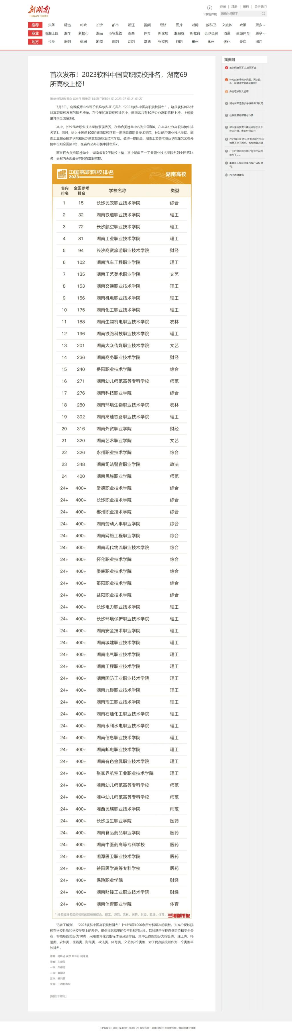 7月3日,新湖南发布《首次发布!2023软科中国高职院校排名,湖南69所高校上榜!》
