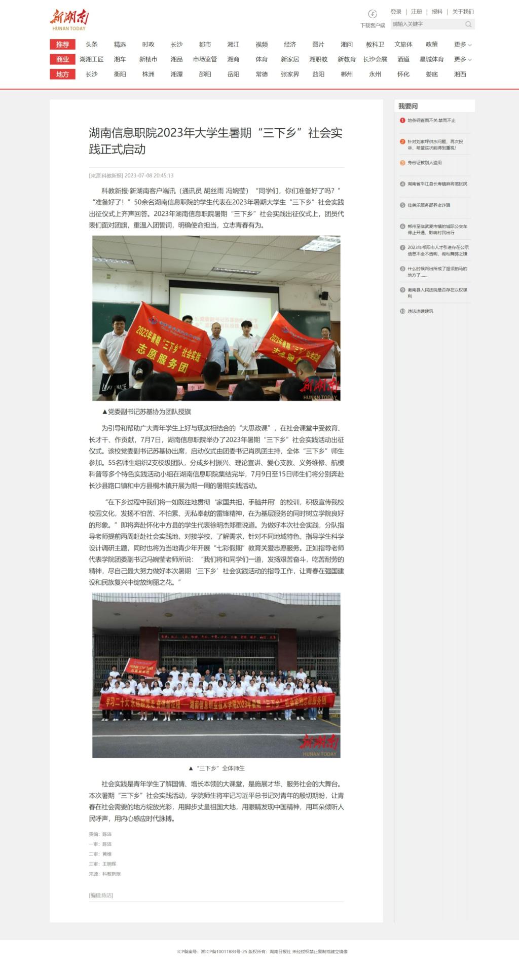 7月8日,新湖南发布《湖南信息职院2023年大学生暑期“三下乡”社会实践正式启动》