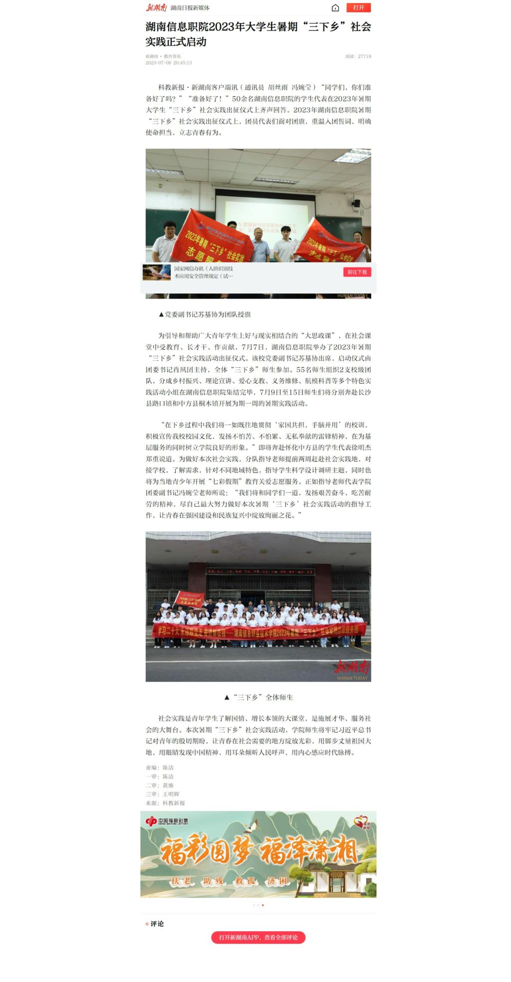 7月8日,新湖南客户端发布《湖南信息职院2023年大学生暑期“三下乡”社会实践正式启动》