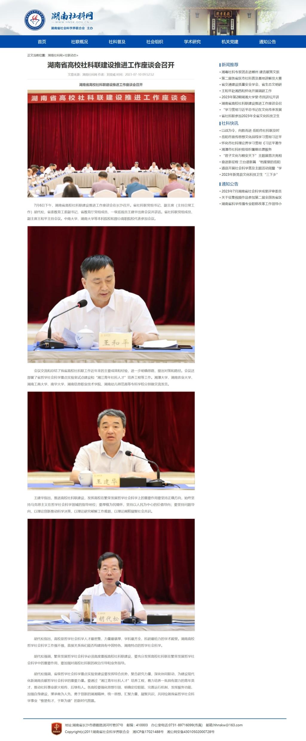 7月10日,湖南社科网发布《湖南省高校社科联建设推进工作座谈会召开》