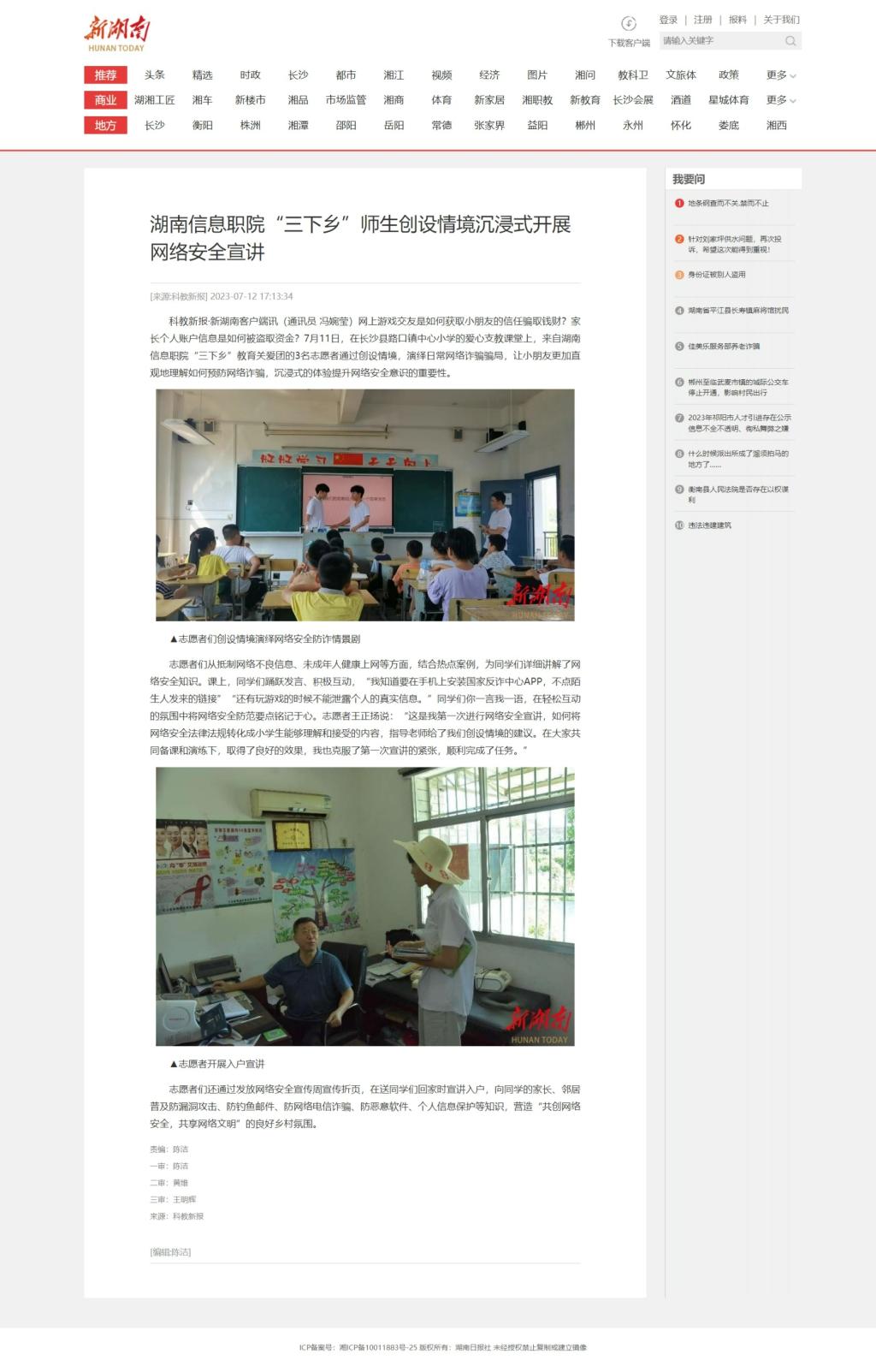 7月12日,新湖南发布《湖南信息职院“三下乡”师生创设情境沉浸式开展网络安全宣讲》
