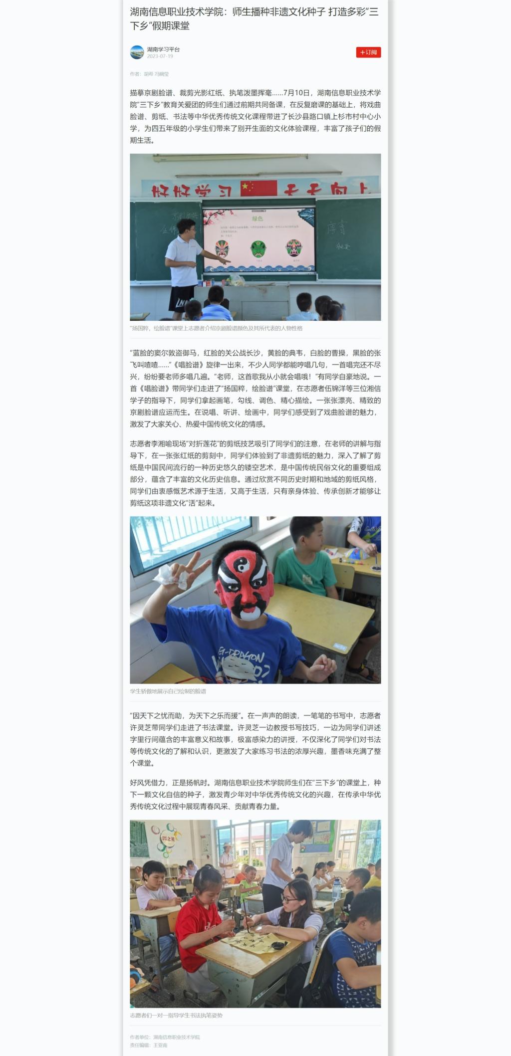 7月19日,学习强国发布《beat365英国官方网站:师生播种非遗文化种子 打造多彩“三下乡”假期课堂》