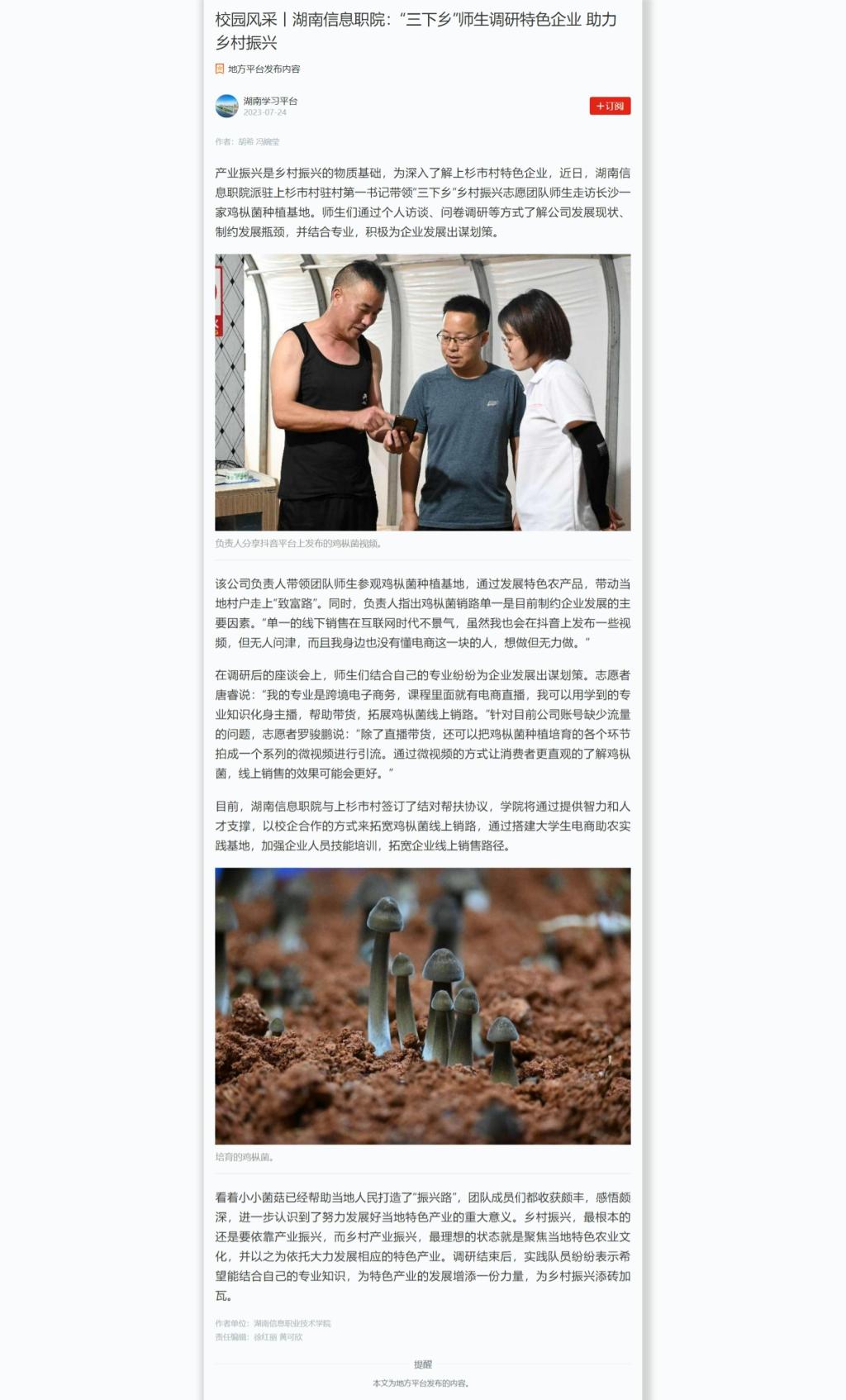 7月24日,学习强国发布《校园风采丨湖南信息职院:“三下乡”师生调研特色企业 助力乡村振兴》