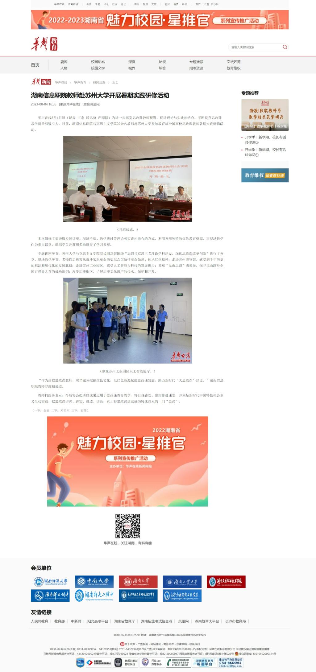 8月4日,华声在线发布《湖南信息职院教师赴苏州大学开展暑期实践研修活动》