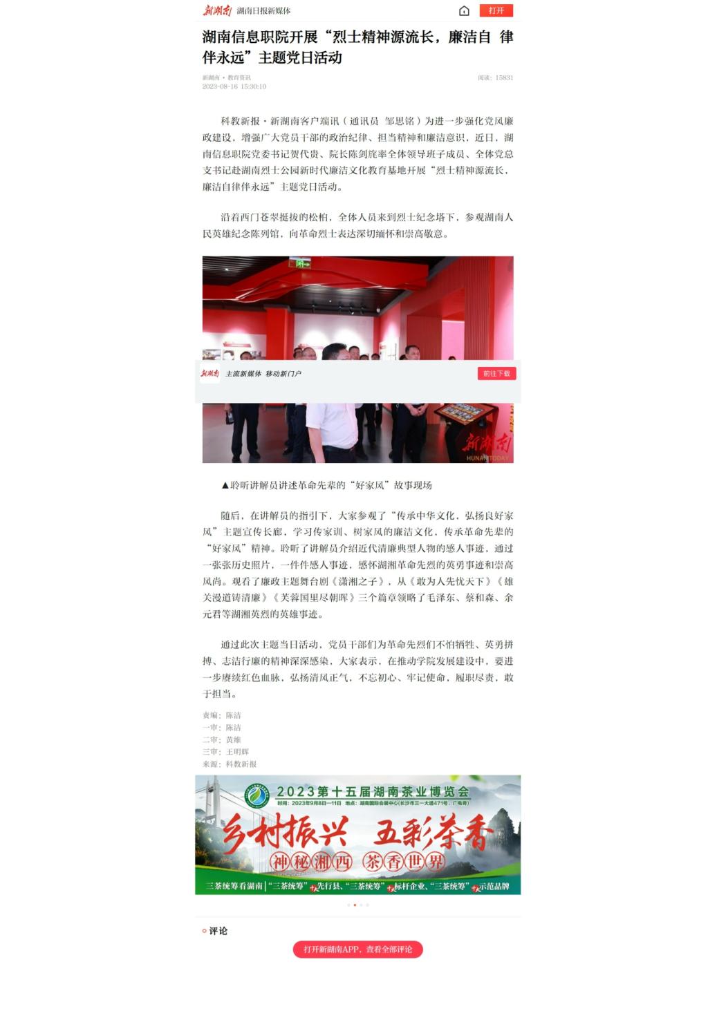 8月16日,新湖南客户端发布《湖南信息职院开展“烈士精神源流长,廉洁自 律伴永远”主题党日活动》