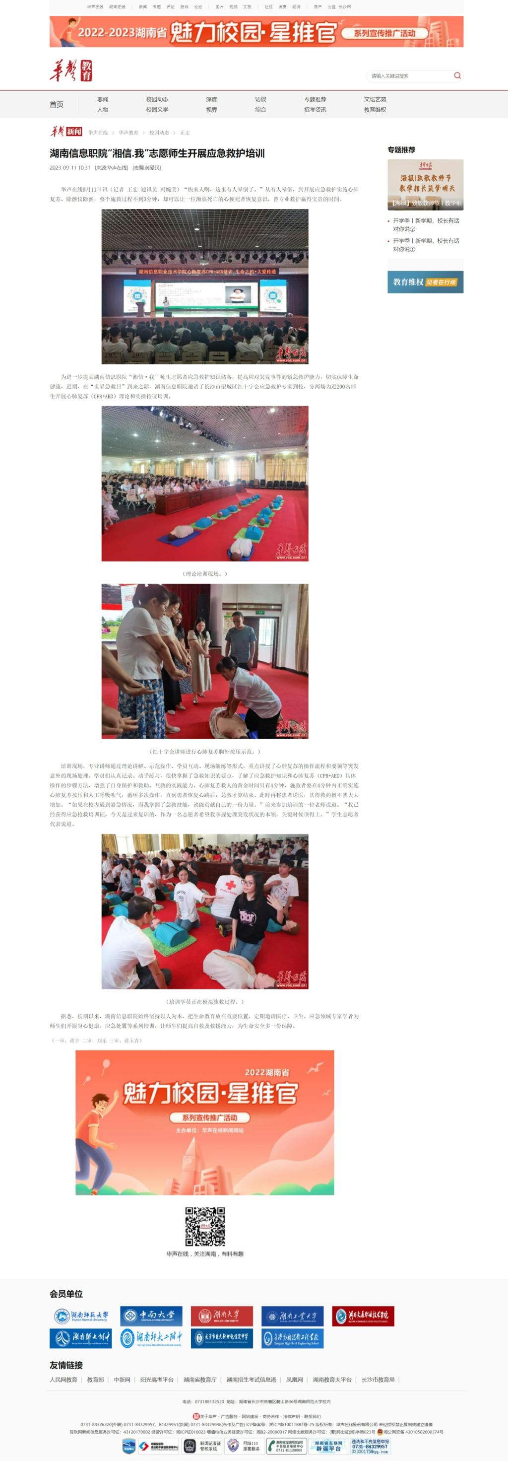 9月11日,华声在线发布《湖南信息职院“湘信.我”志愿师生开展应急救护培训》