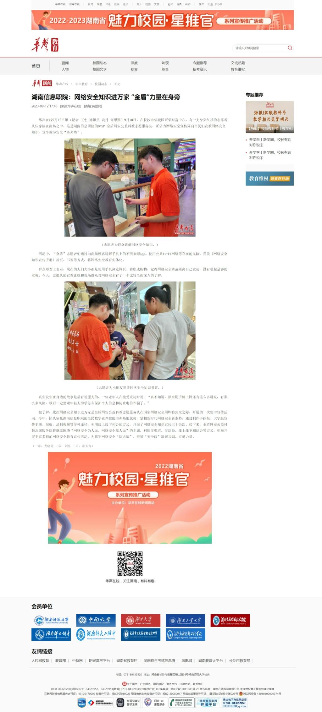 9月12日,华声在线发布《湖南信息职院:网络安全知识进万家 “金盾”力量在身旁》