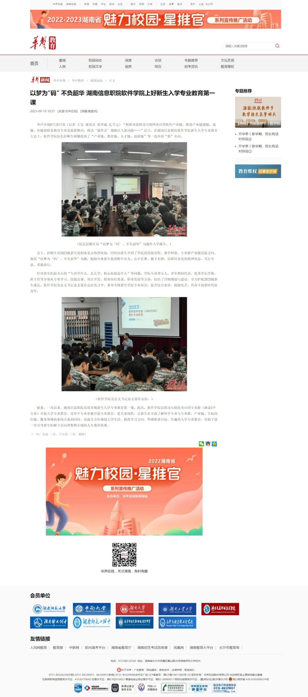 9月19日,华声在线发布《以梦为“码” 不负韶华 湖南信息职院软件学院上好新生入学专业教育第一课》