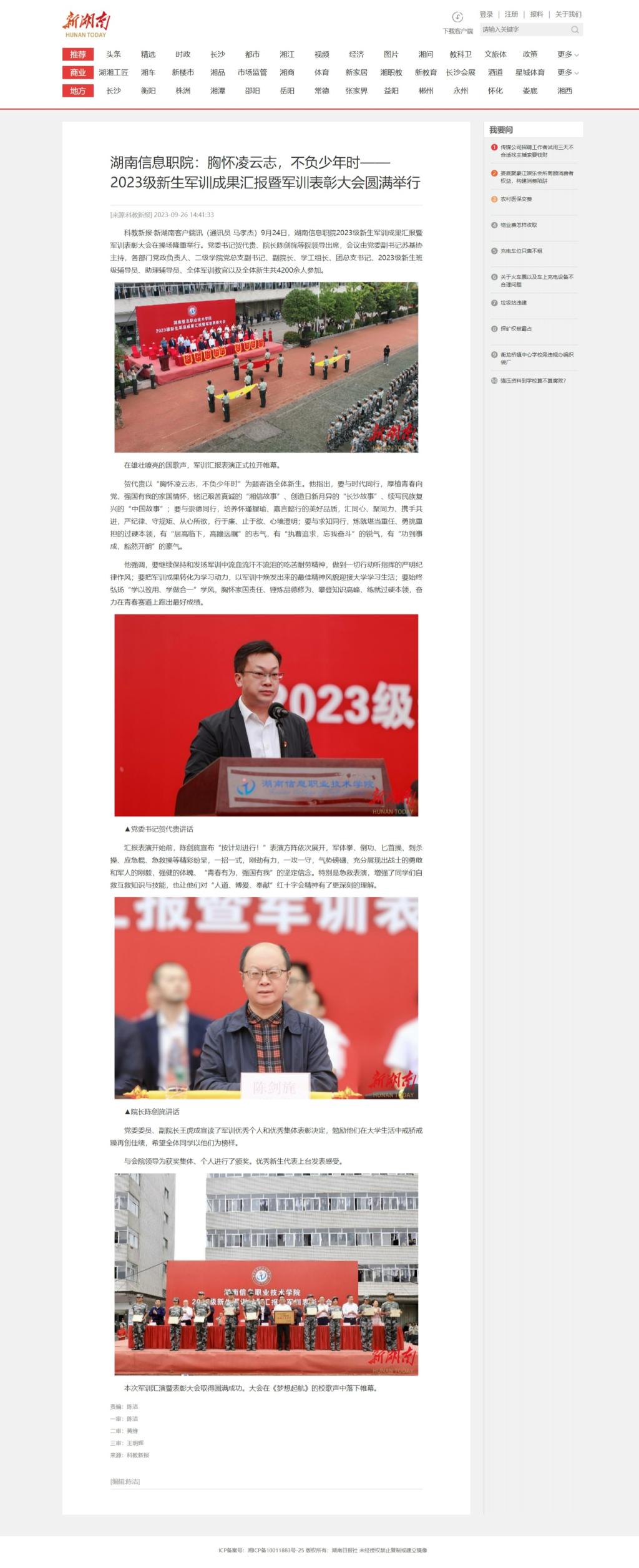 9月26日,新湖南发布《湖南信息职院:胸怀凌云志,不负少年时——2023级新生军训成果汇报暨军训表彰大会圆满举行》