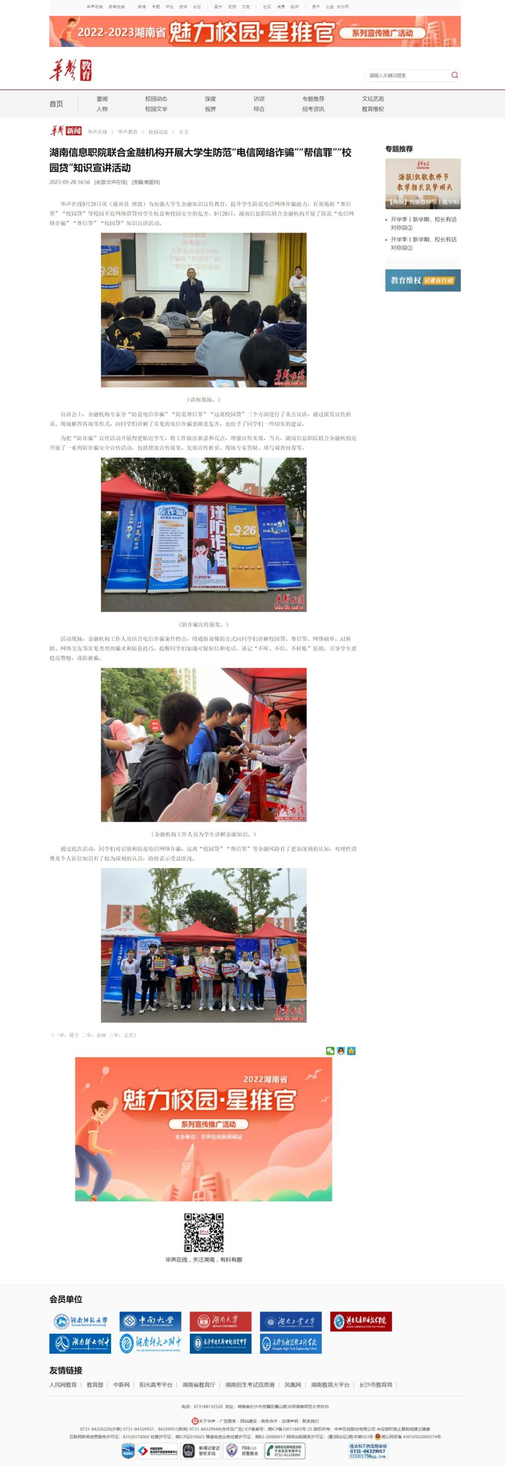 9月28日,华声在线发布《湖南信息职院联合金融机构开展大学生防范“电信网络诈骗”“帮信罪”“校园贷”知识宣讲活动》