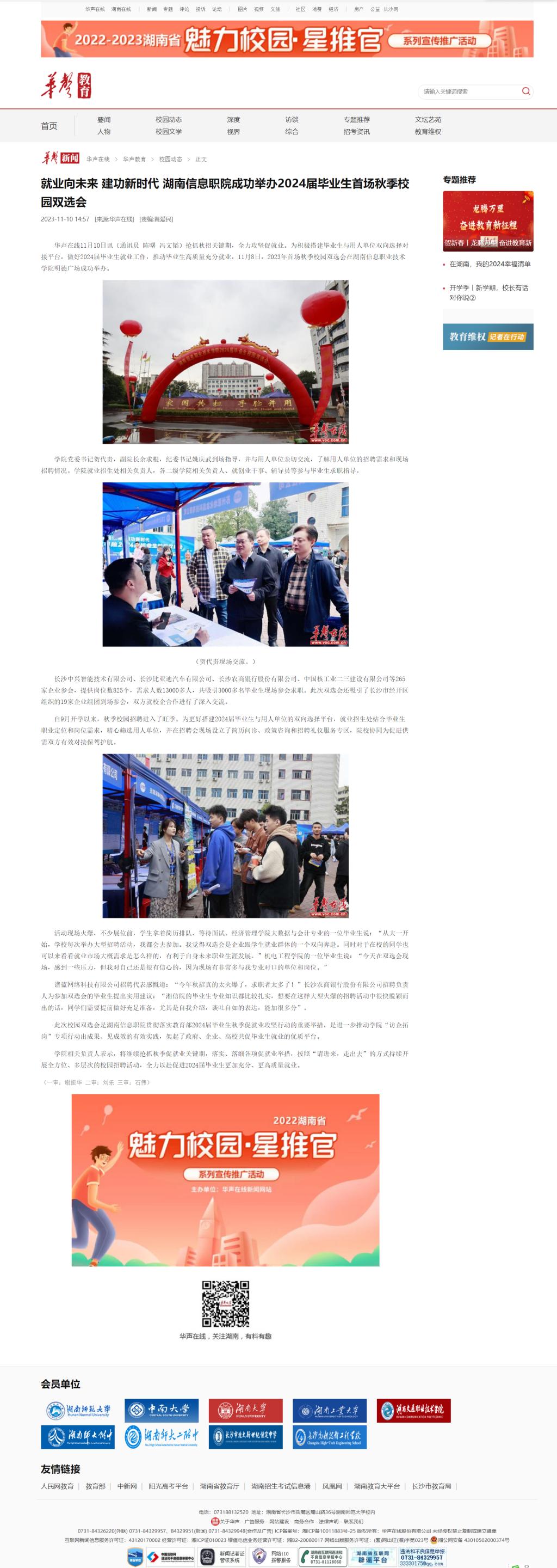 11月10日,华声在线发布《就业向未来 建功新时代 湖南信息职院成功举办2024届毕业生首场秋季校园双选会》