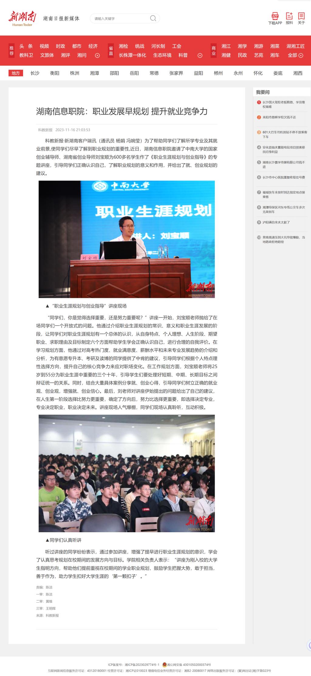11月16日,华声在线发布《湖南信息职院:职业发展早规划 提升就业竞争力》
