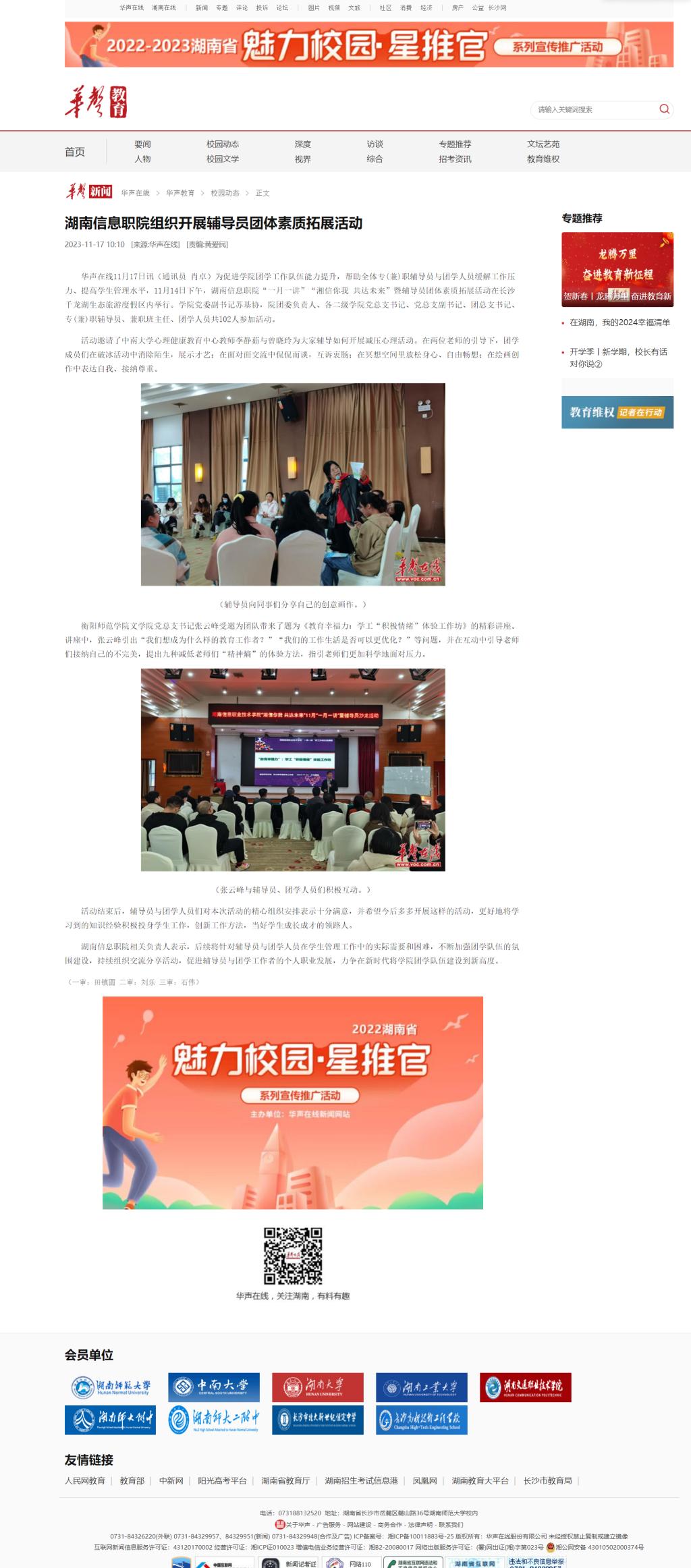 11月17日,华声在线发布《湖南信息职院组织开展辅导员团体素质拓展活动》