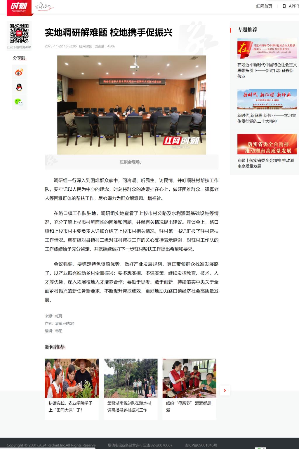 11月22日,红网发布《实地调研解难题 校地携手促振兴》