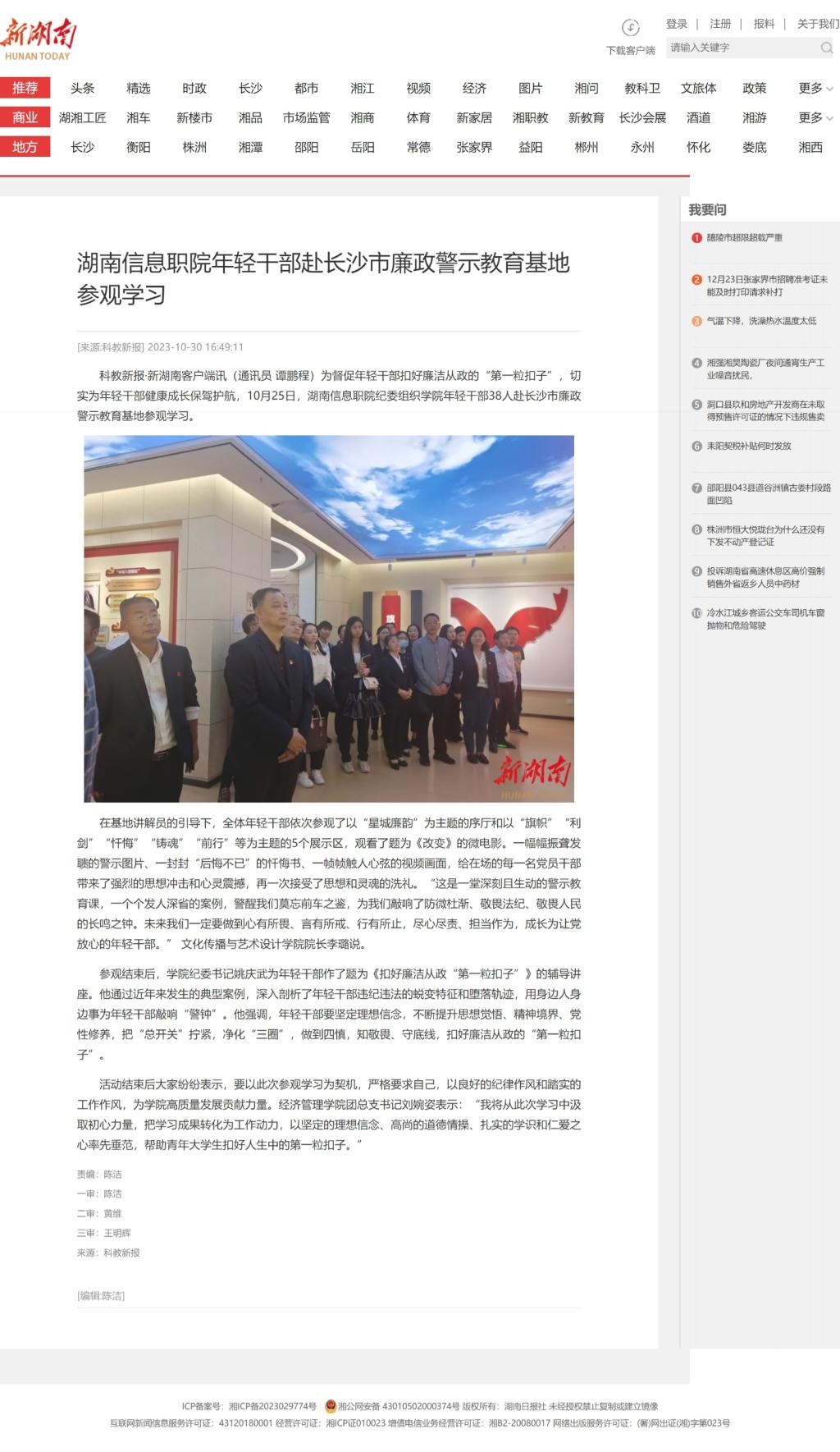 10月30日,新湖南发布《湖南信息职院年轻干部赴长沙市廉政警示教育基地参观学习》