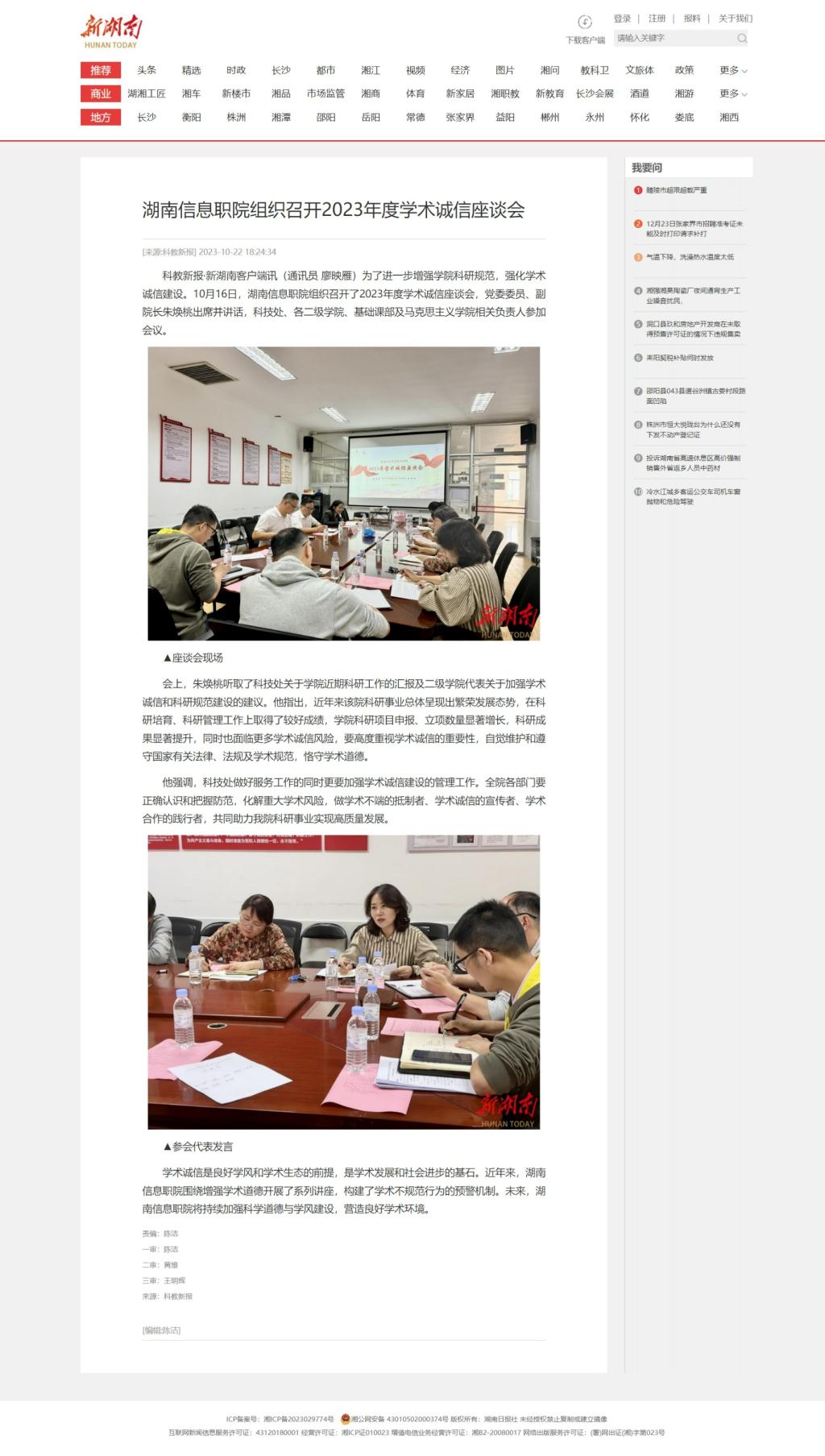 10月22日,新湖南发布《湖南信息职院组织召开2023年度学术诚信座谈会》