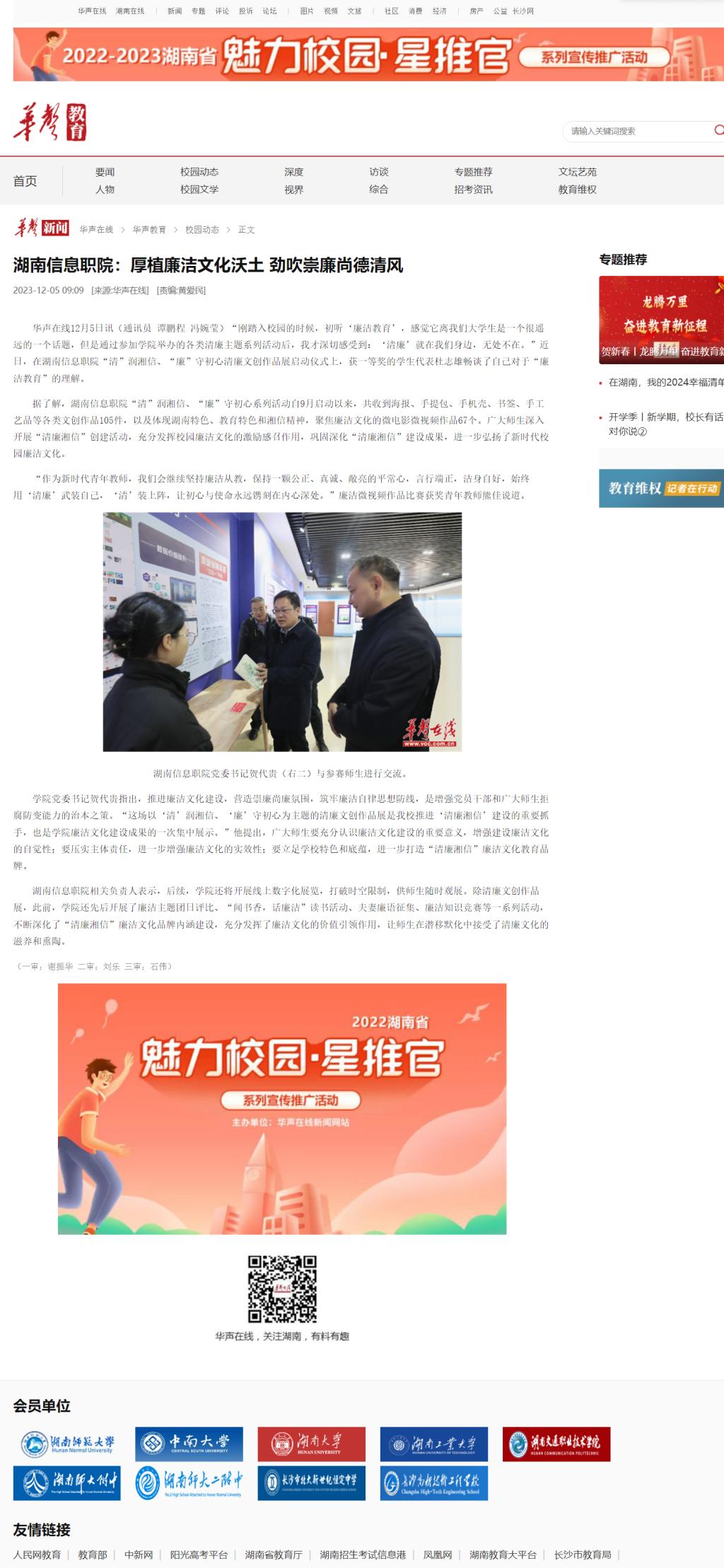12月5日,华声在线发布《湖南信息职院:厚植廉洁文化沃土 劲吹崇廉尚德清风》