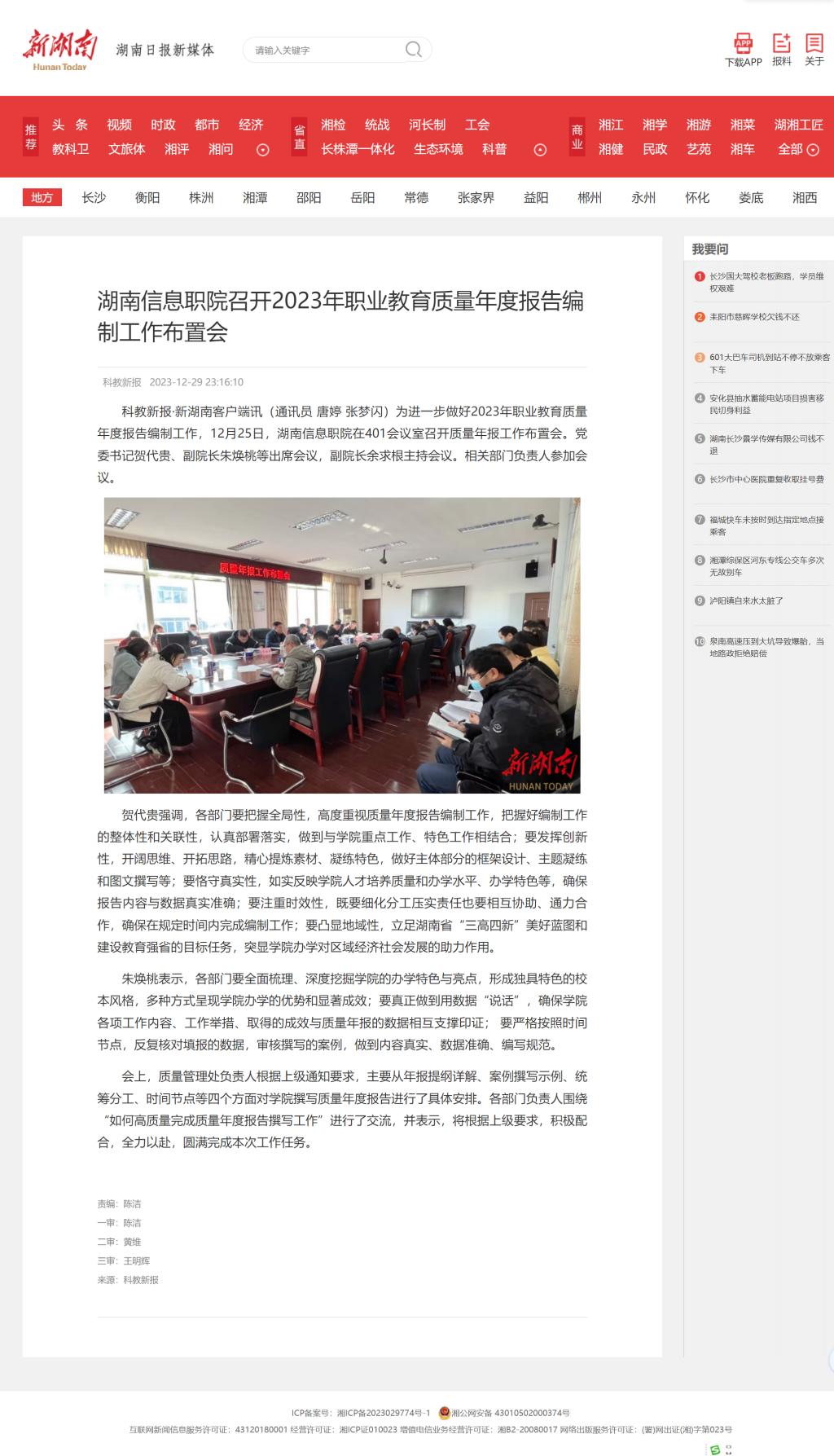 12月29日,新湖南发布《湖南信息职院召开2023年职业教育质量年度报告编制工作布置会》