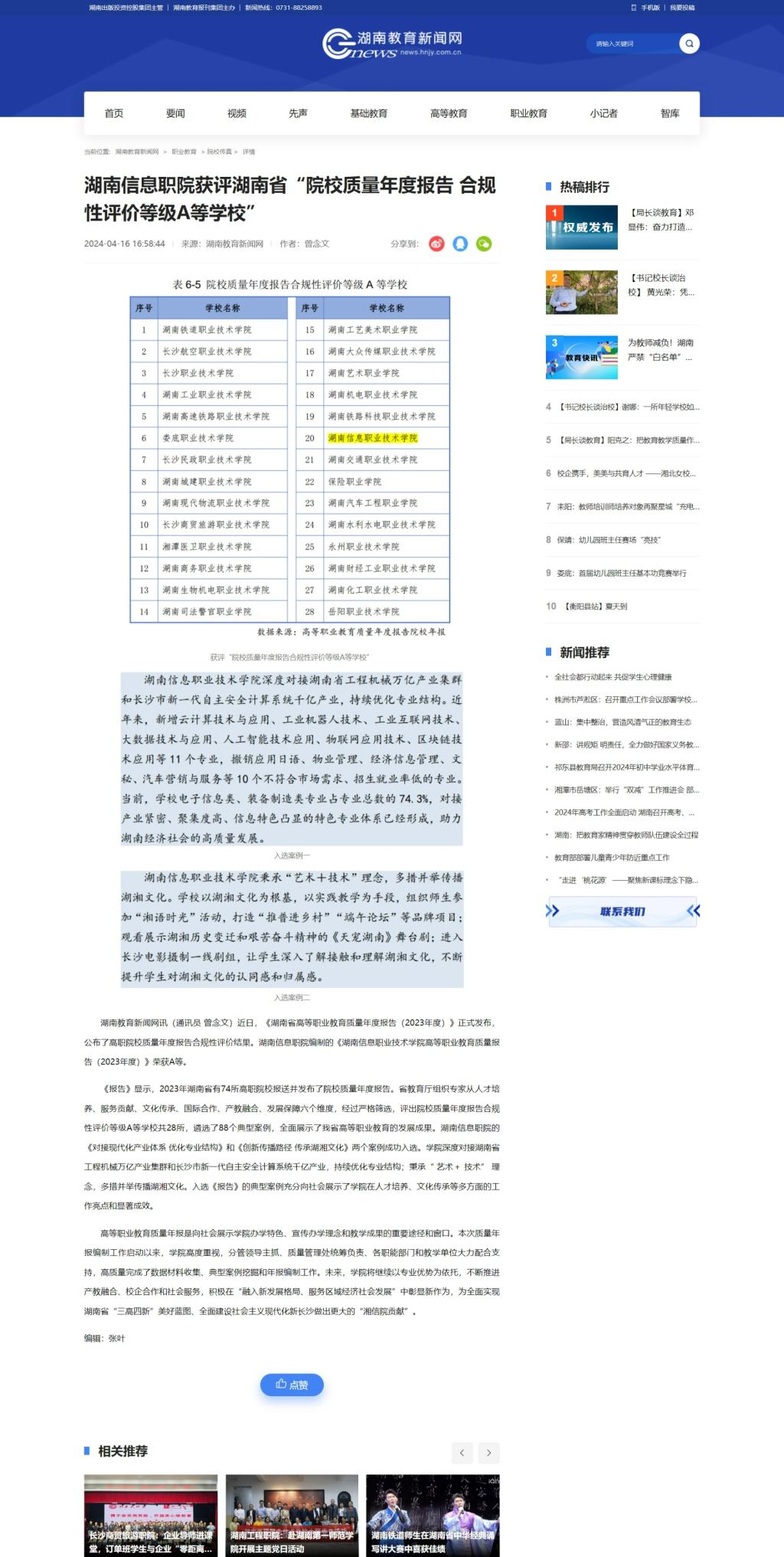 4月16日,湖南教育新闻网发布《湖南信息职院获评湖南省“院校质量年度报告 合规性评价等级A等学校”》