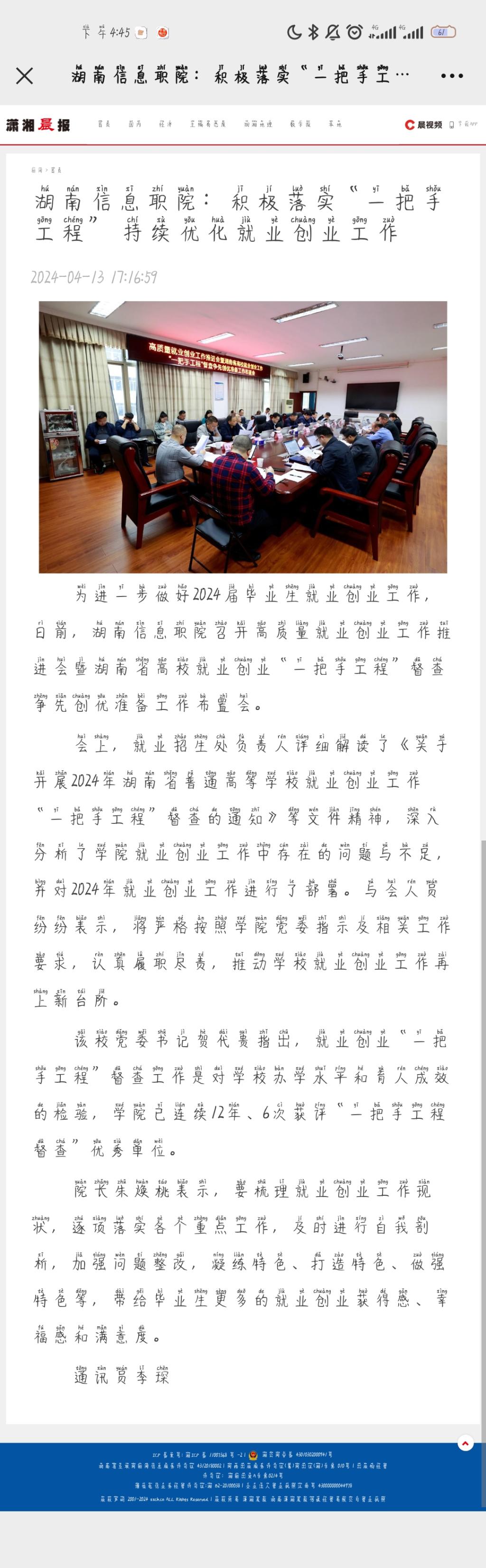 4月13日,潇湘晨报网发布《湖南信息职院:积极落实“一把手工程” 持续优化就业创业工作》