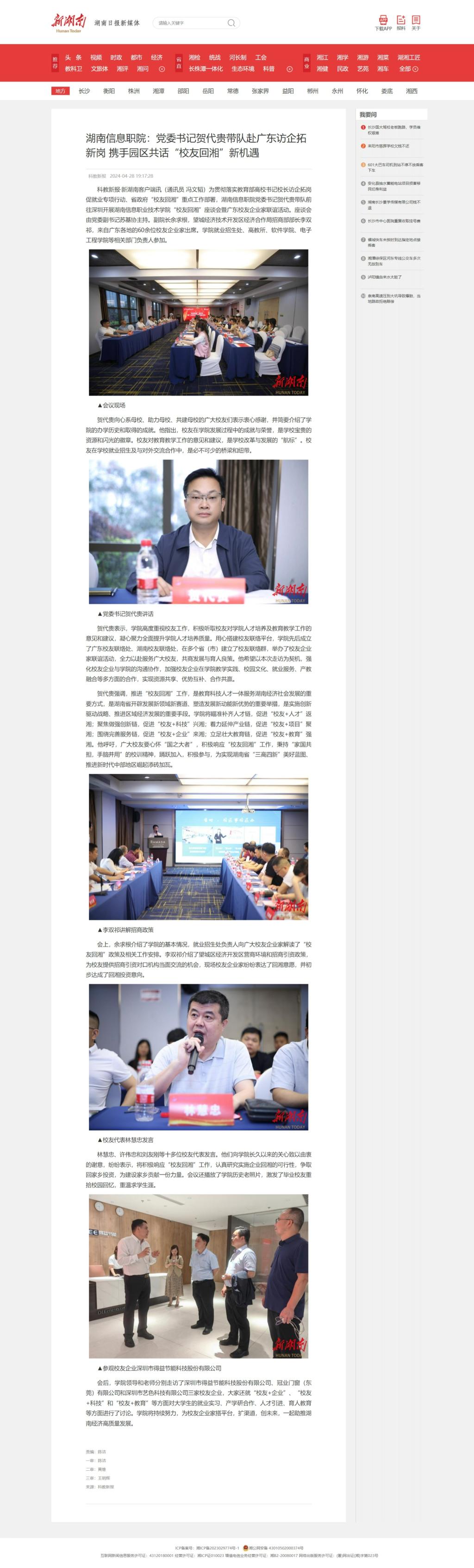 4月28日,新湖南发布《湖南信息职院:党委书记贺代贵带队赴广东访企拓新岗 携手园区共话“校友回湘”新机遇》