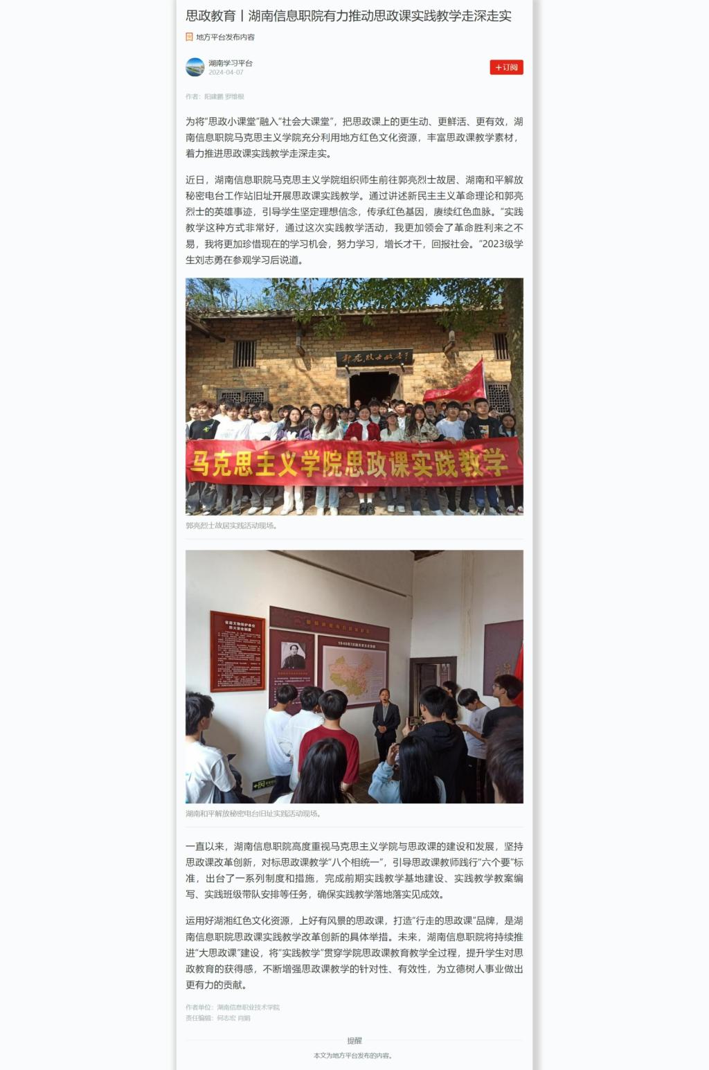4月7日,学习强国发布《思政教育丨湖南信息职院有力推动思政课实践教学走深走实》