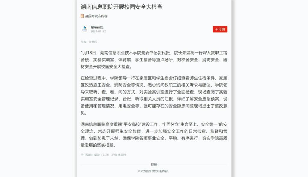 1月22日,学习强国发布《湖南信息职院开展校园安全大检查》