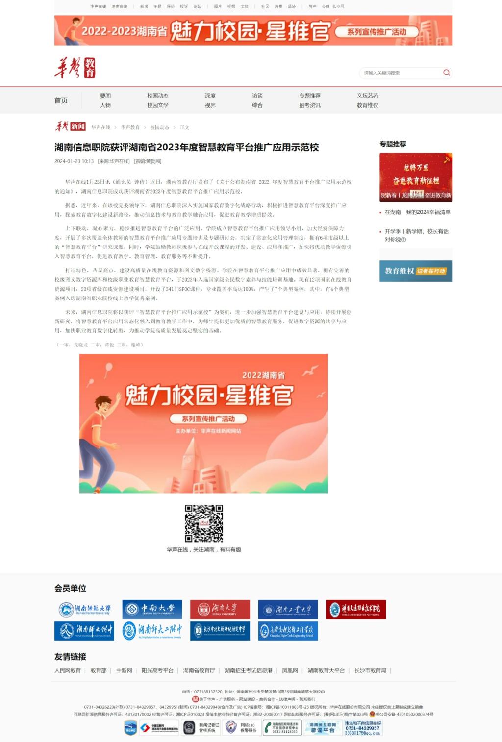 1月23日,华声在线发布《湖南信息职院获评湖南省2023年度智慧教育平台推广应用示范校》