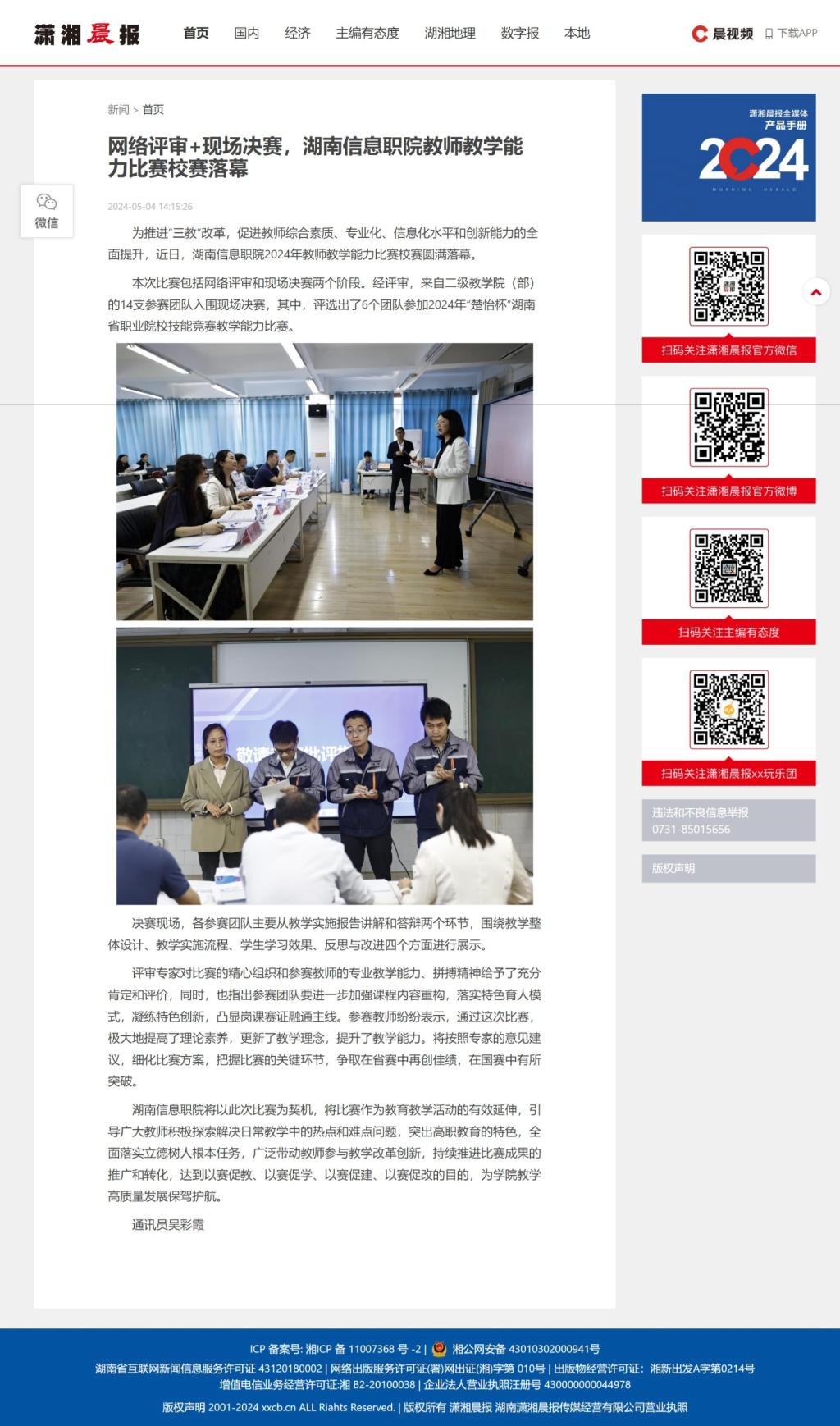 5月4日,潇湘晨报网发布《网络评审+现场决赛,湖南信息职院教师教学能力比赛校赛落幕》。