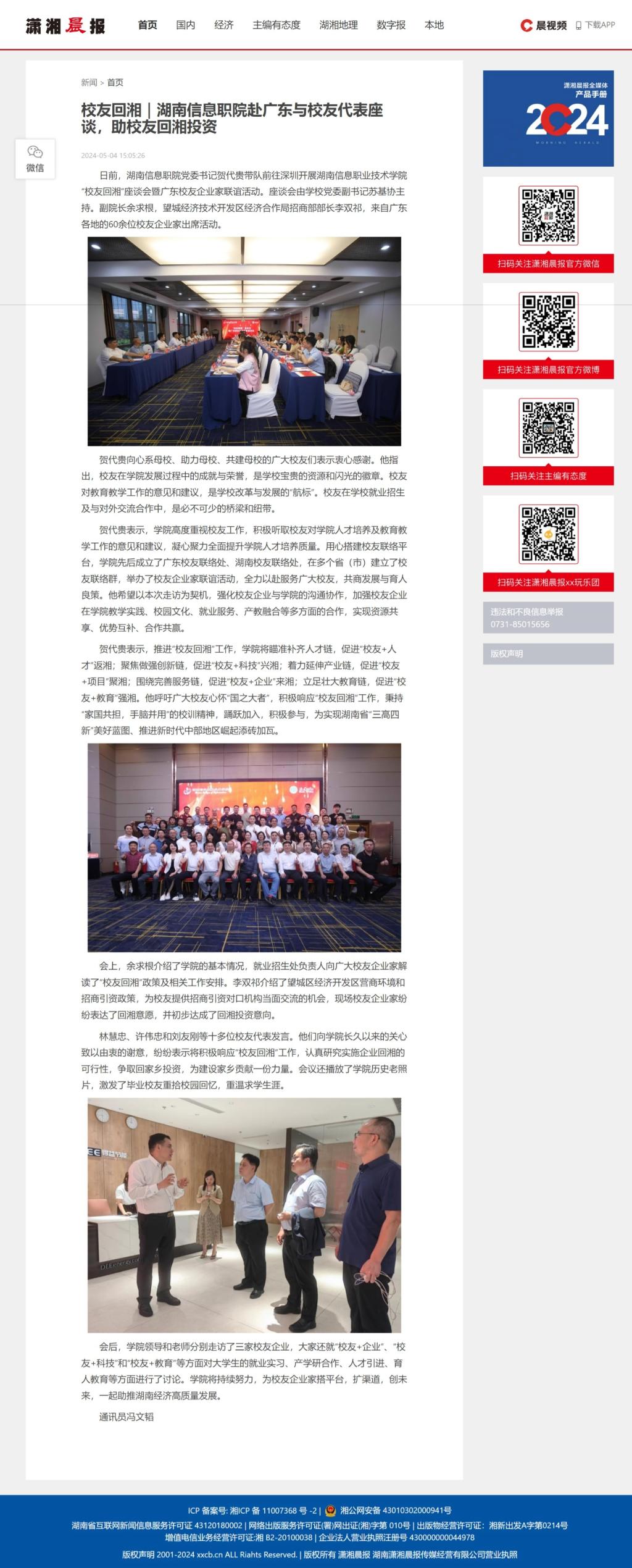 5月4日,潇湘晨报网发布《校友回湘|湖南信息职院赴广东与校友代表座谈,助校友回湘投资》。