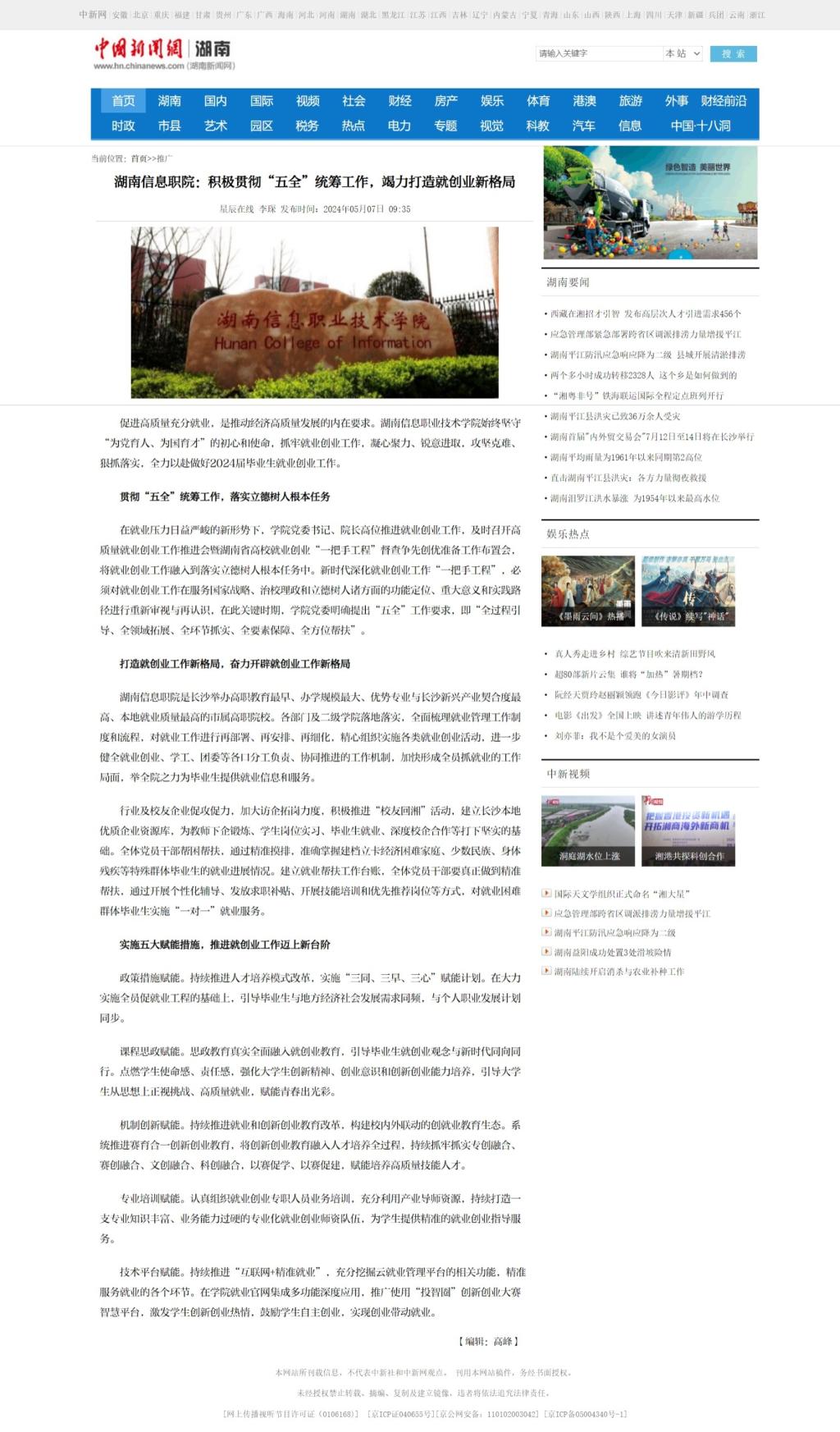 5月7日,中国新闻网发布《湖南信息职院:积极贯彻“五全”统筹工作,竭力打造就创业新格局》。