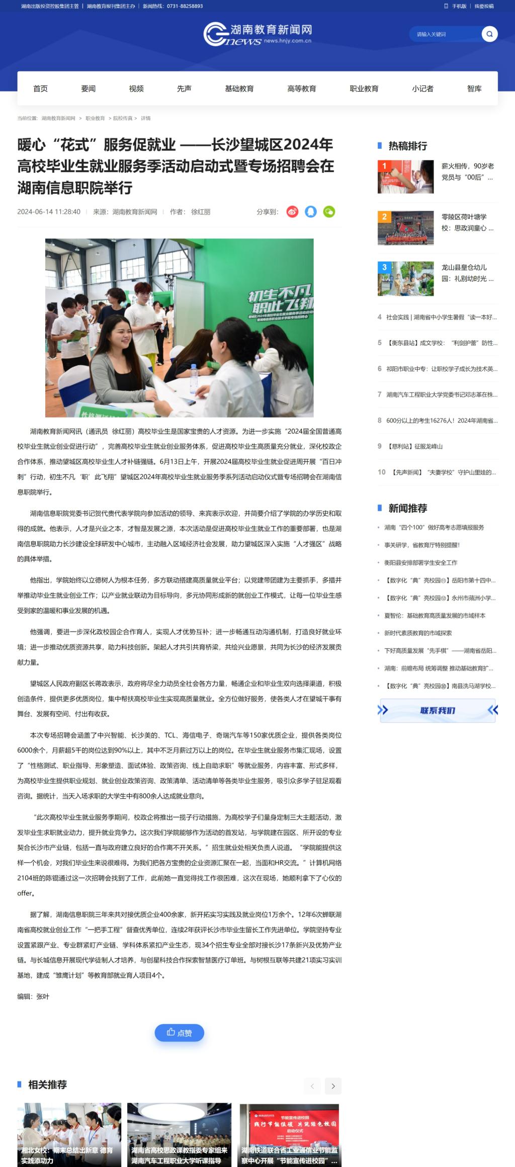 6月14日,湖南教育新闻网发布《暖心“花式”服务促就业 ——长沙望城区2024年高校毕业生就业服务季活动启动式暨专场招聘会在湖南信息职院举行》