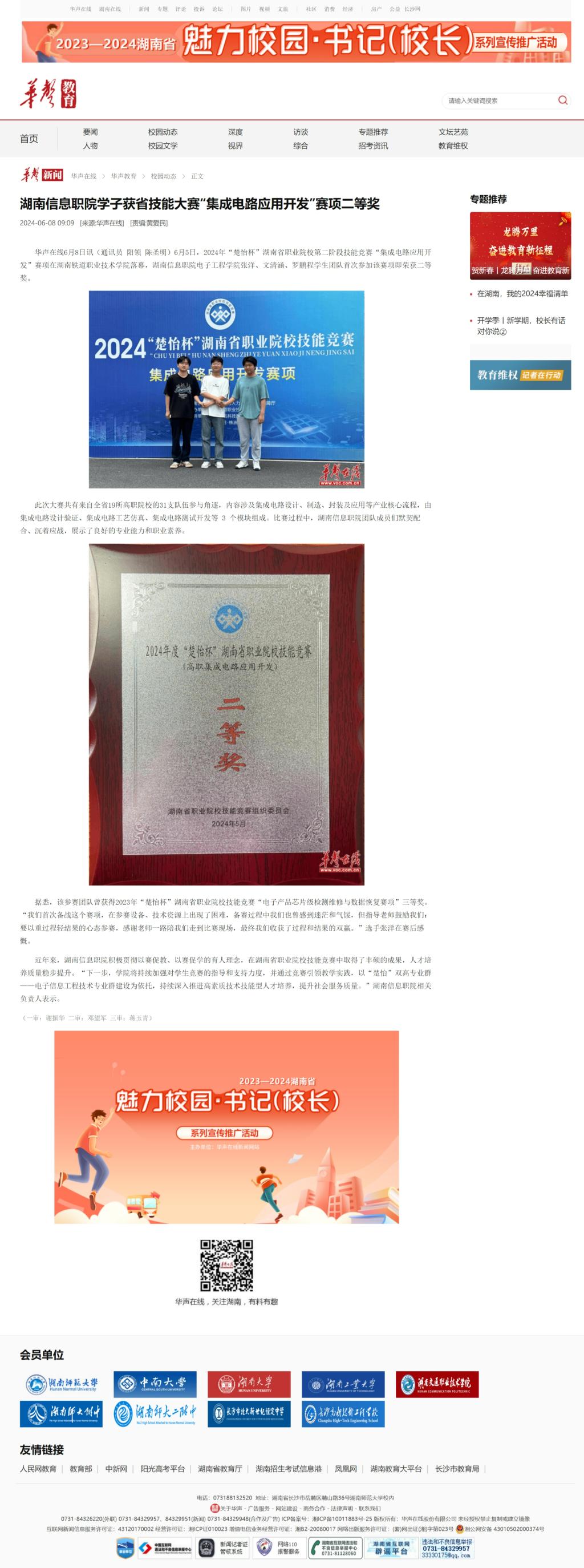 6月8日,华声在线发布《湖南信息职院学子获省技能大赛“集成电路应用开发”赛项二等奖》