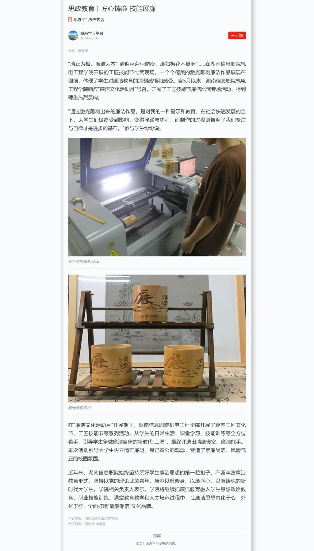 6月6日,学习强国发布《思政教育丨匠心铸廉 技能展廉》