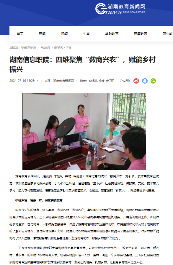7月16日,湖南教育新闻网发布《湖南信息职院:四维聚焦“数商兴农”,赋能乡村振兴》