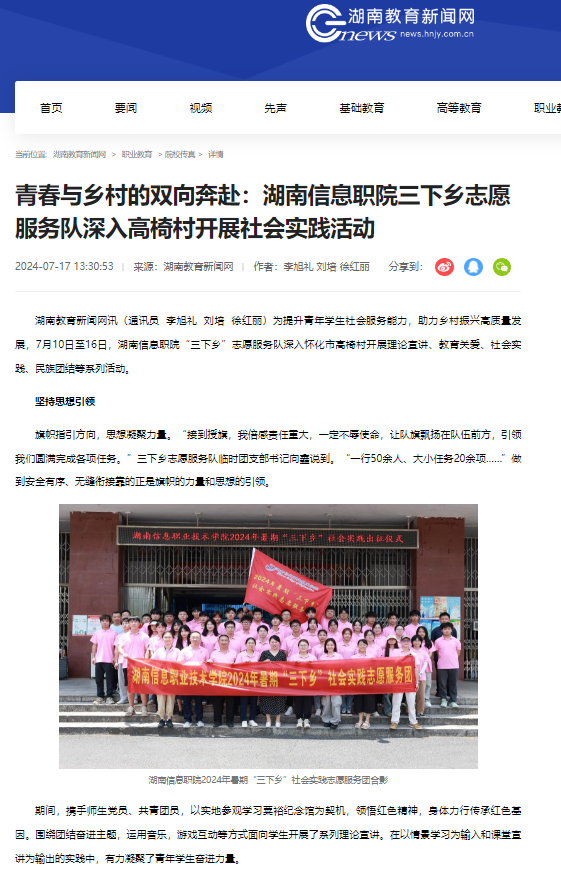 7月17日,湖南教育新闻网发布《青春与乡村的双向奔赴:湖南信息职院三下乡志愿服务队深入高椅村开展社会实践活动》