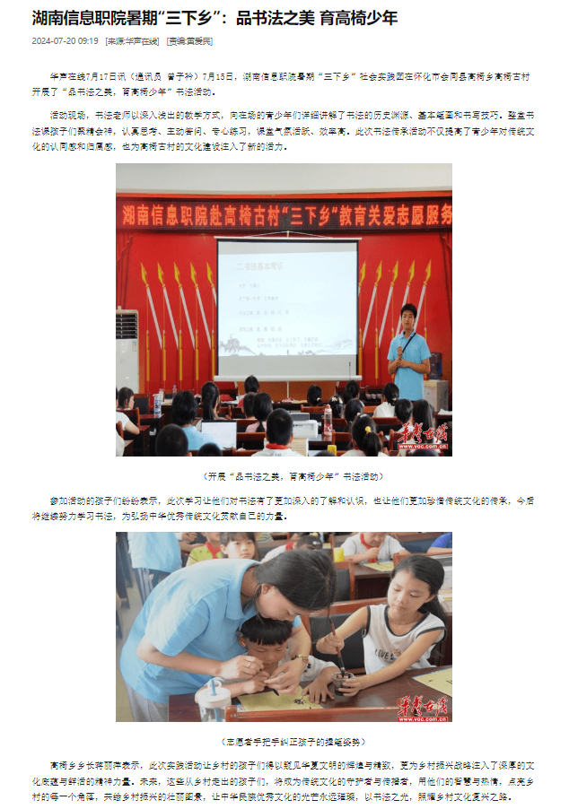7月20日,华声在线发布《湖南信息职院暑期“三下乡”:品书法之美 育高椅少年》
